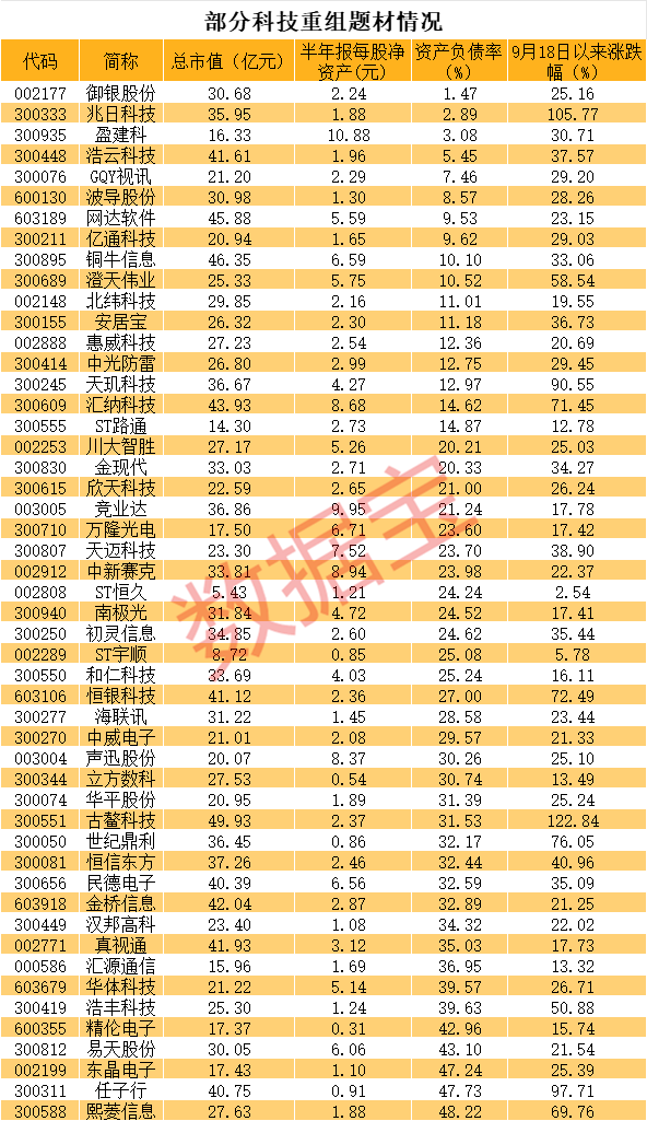 此外,数据宝从电子、计算机、通信等三大科技行业中筛选出了一批重组潜力股。这些个股市值均在50亿元以下,滚动市盈率为负或超过百倍,上半年营收低于2亿元,且半年报每股净资产为正、资产负债率低于50%。其中,ST恒久、ST宇顺等个股市值均不足20亿元;盈建科、中新赛克等个股的每股净资产均超过5元/股;御银股份、兆日科技等个股的半年报负债率则不足10%。部分央国企个股如GQY视讯、中新赛克等也值得关注。