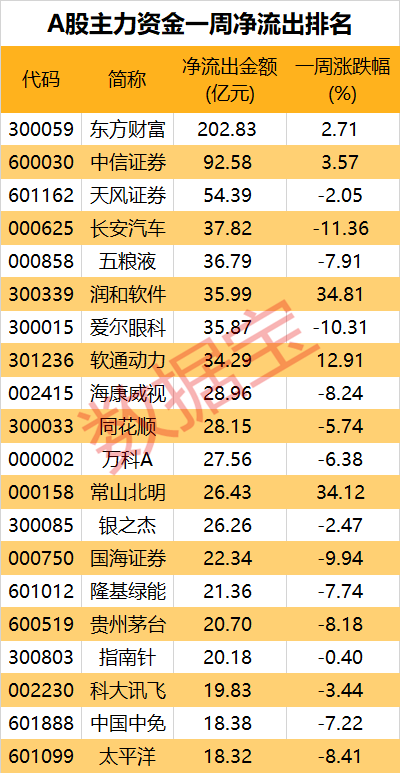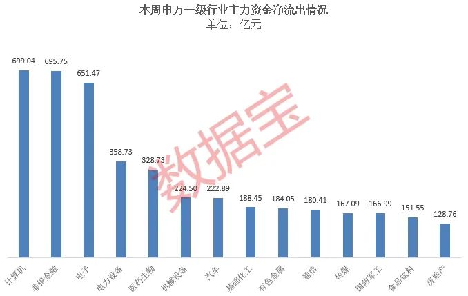 然而,本周A股主力资金净流出合计高达5029.81亿元,为近一年最高值。申万一级行业均遭遇主力资金撤离,其中计算机、非银金融、电子行业净流出额居前。从个股资金流向来看,东方财富、中信证券、天风证券等券商股净流出额排名前三。