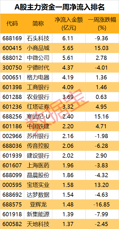 尽管市场回调,但部分板块和个股仍获主力资金青睐。例如,半导体板块中的寒武纪-U、晶晨股份、中微公司等股本周净流入金额居前。此外,银行股也获得主力资金加仓,工商银行、农业银行、建设银行、苏州银行等股净流入额均超过2亿元。