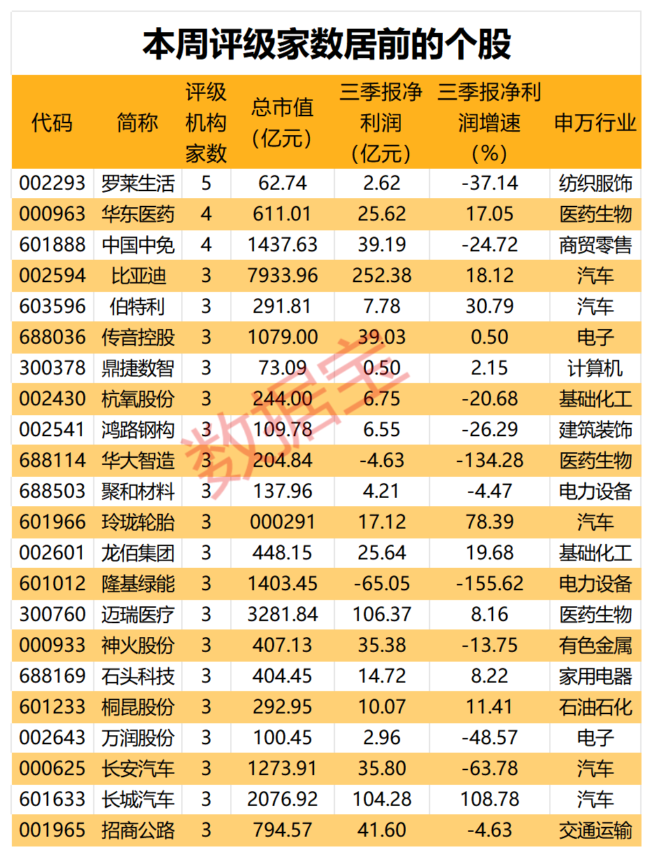 高密集政策落地,消费信心呈现回暖趋势。据证券时报·数据宝统计,11月10日至11月15日,54家机构合计进行511次评级,415只股票被券商研报赋予“买入型”评级。其中,罗莱生活以5家机构评级高居榜首,华东医药、中国中免紧随其后,各有4家机构评级。此外,比亚迪、伯特利、玲珑轮胎、长安汽车、长城汽车等汽车股亦榜上有名。