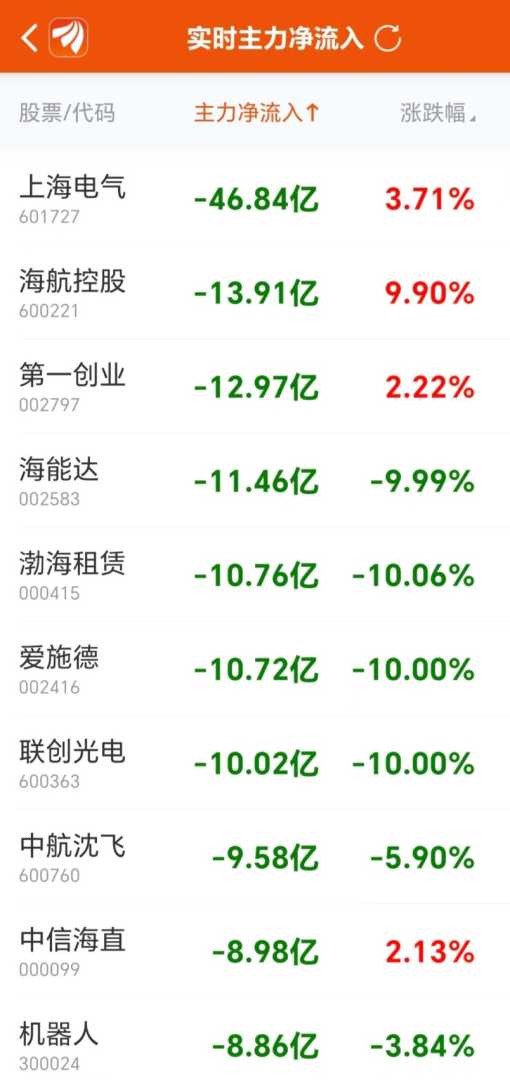 然而,在主力净卖出方面,也有部分个股遭遇大额抛售。东方财富Choice数据显示,11月7日主力净卖出前十大个股中,上海电气以46.84亿元的净卖出额位居榜首,海航控股则以13.91亿元的净卖出额紧随其后。这些个股的下跌对市场造成了一定的拖累。