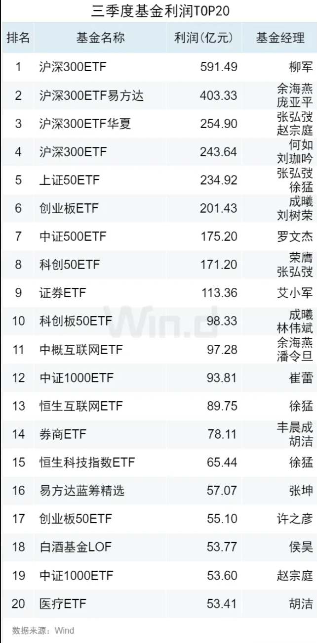 从三季度利润排名来看,前10的基金中,宽基ETF基金占据了绝大多数,利润普遍超过百亿元。其中,华泰柏瑞沪深300ETF以591.49亿元的利润高居榜首,紧随其后的是沪深300ETF易方达,利润达到403.33亿元。排名前9的基金均为ETF基金,且季内利润均超过100亿元。