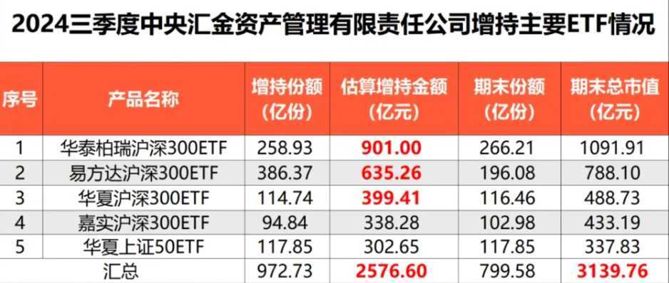 具体来看,从2024年三季末数据可以看出,中央汇金资产在三季度大举增持主流ETF近千亿份,估算增持金额超过2500亿元。其中,沪深300指数ETF成为主要增持对象,华泰柏瑞、易方达、华夏、嘉实旗下的沪深300ETF均获得了数百亿元规模的增持。截至2024年三季度末,中央汇金资产持有的上述主流ETF总市值已超过3100亿元。