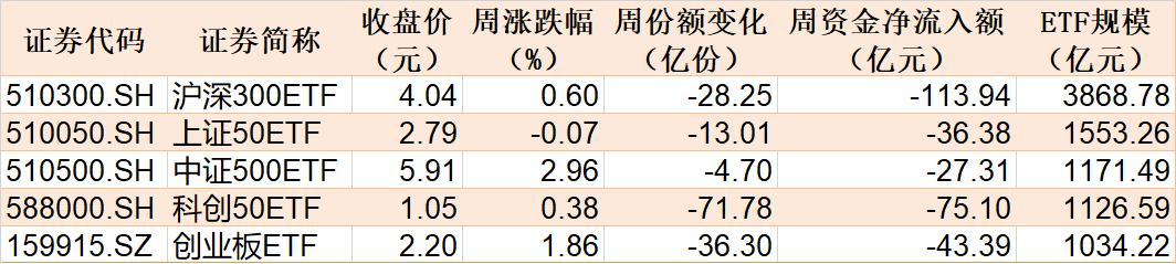 本周,沪深两市的股指在震荡中展现出走强态势,而与之相伴的是,沪深两市股票型ETF和跨境型ETF却合计净流出约500亿元。