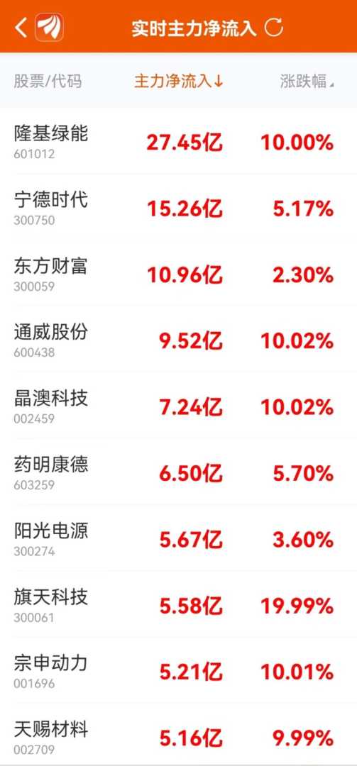 根据东方财富Choice数据显示,10月25日主力净买入前十大个股中,隆基绿能位居榜首,主力净买入额达到27.45亿元,该股当日涨停;宁德时代紧随其后,主力净买入额为15.26亿元。