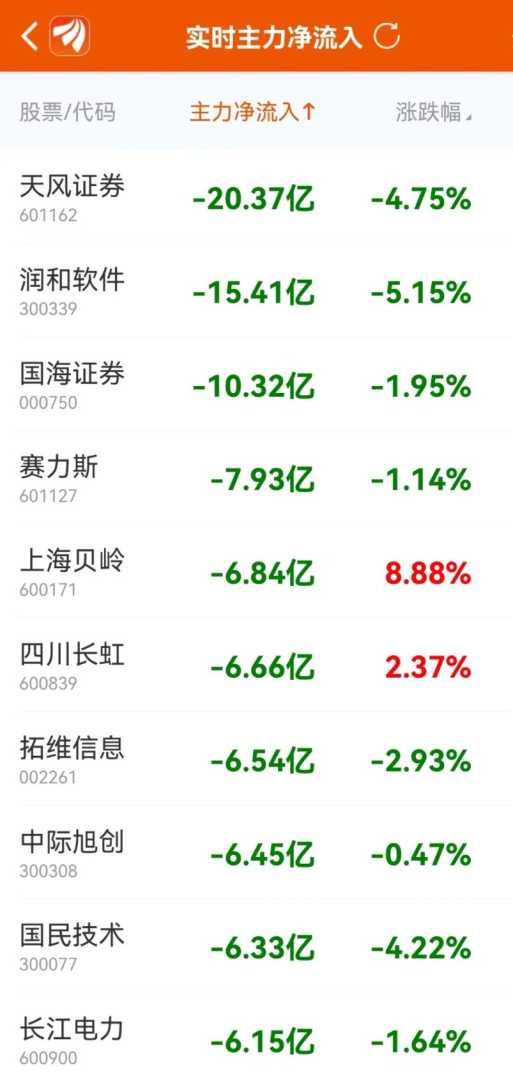而在主力净卖出方面,数据显示,10月25日主力净卖出前十大个股中,天风证券位居第一,主力净卖出额高达20.37亿元;润和软件排名第二,主力净卖出额为15.41亿元。