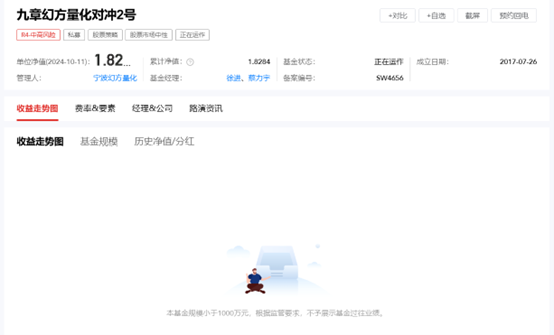 据第一财经记者了解,幻方量化部分对冲系列产品的规模已经压降至千万规模以下。例如,正在运作的“对冲2号”产品,截至10月11日最新净值为1.82,但因基金规模小于1000万元,未展示过往业绩。
