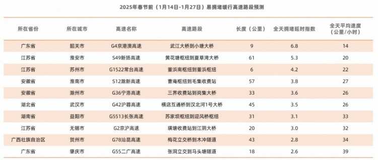 春节前(1月14日至1月27日),预计粤港澳大湾区、长三角等经济发达地区以及受天气影响较大的湖南、湖北、广西等地的高速公路将出现拥堵。其中,G4京港澳高速韶关段(武江大桥到小塘大桥)以全天拥堵延时指数6.8、平均车速约14公里/小时,成为最为拥堵的路段。