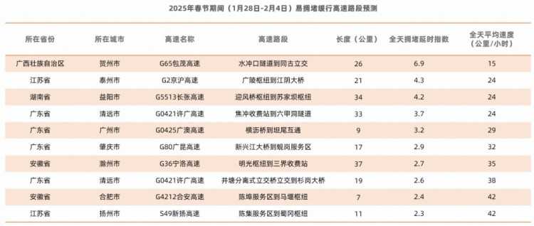 春节期间(1月28日至2月4日),G65包茂高速贺州段(水冲口隧道到同古立交)预计将是最为拥堵的路段,全天拥堵延时指数达到6.9,平均车速约为15公里/小时。此外,G2京沪高速泰州段、G5513长张高速益阳段等也将面临较大的交通压力。