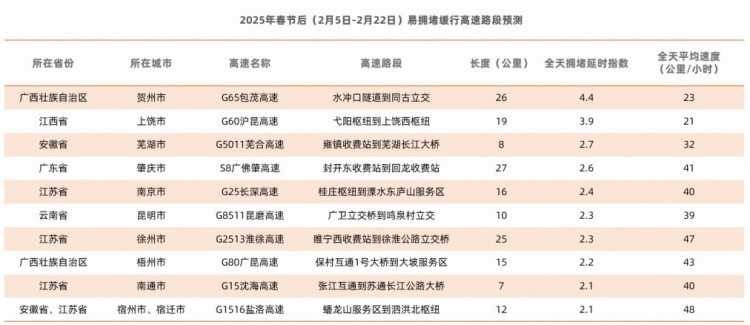 春节后(2月5日至2月22日),G65包茂高速贺州段(水冲口隧道到同古立交)仍将是易拥堵路段,但拥堵程度有所缓解,全天拥堵延时指数约为4.4,平均车速提升至23公里/小时。G60沪昆高速上饶段、G5011芜合高速芜湖段等也需关注。