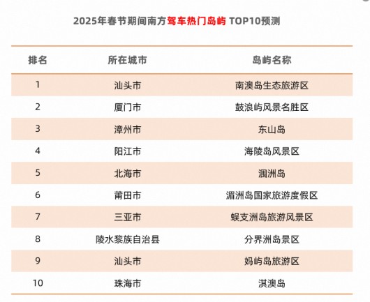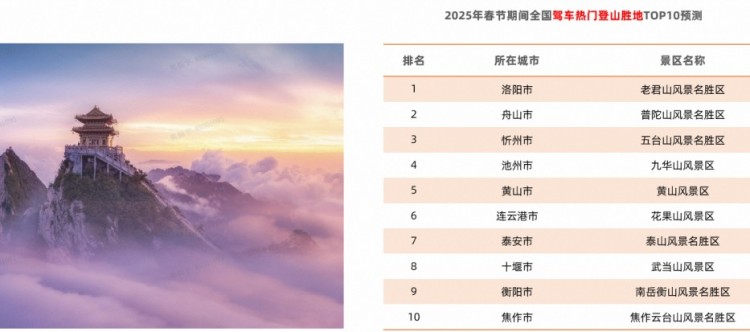 对于喜欢海滨风光的游客来说,汕头市南澳岛生态旅游区、厦门市鼓浪屿风景名胜区、漳州市东山岛等南方岛屿成为春节期间热门自驾目的地。此外,洛阳市老君山风景名胜区、舟山市普陀山风景名胜区等登山胜地以及凤凰古城、大理古城等古城(镇)也吸引了大量游客。