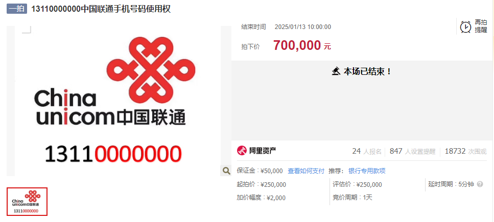 【大河财立方消息】2025年1月13日,备受瞩目的中国联通手机号码“13110000000”使用权在阿里巴巴司法拍卖平台上顺利完成了转让程序。