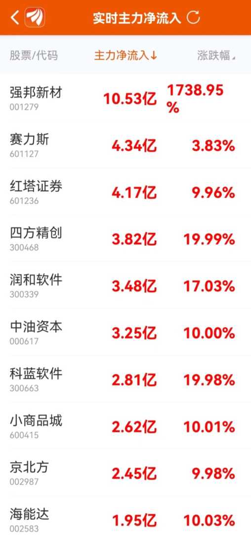 在个股方面,东方财富Choice数据显示,10月11日主力净买入金额排名前十的个股中,强邦新材独占鳌头,主力净买入金额高达10.53亿元;赛力斯紧随其后,主力净买入4.34亿元。