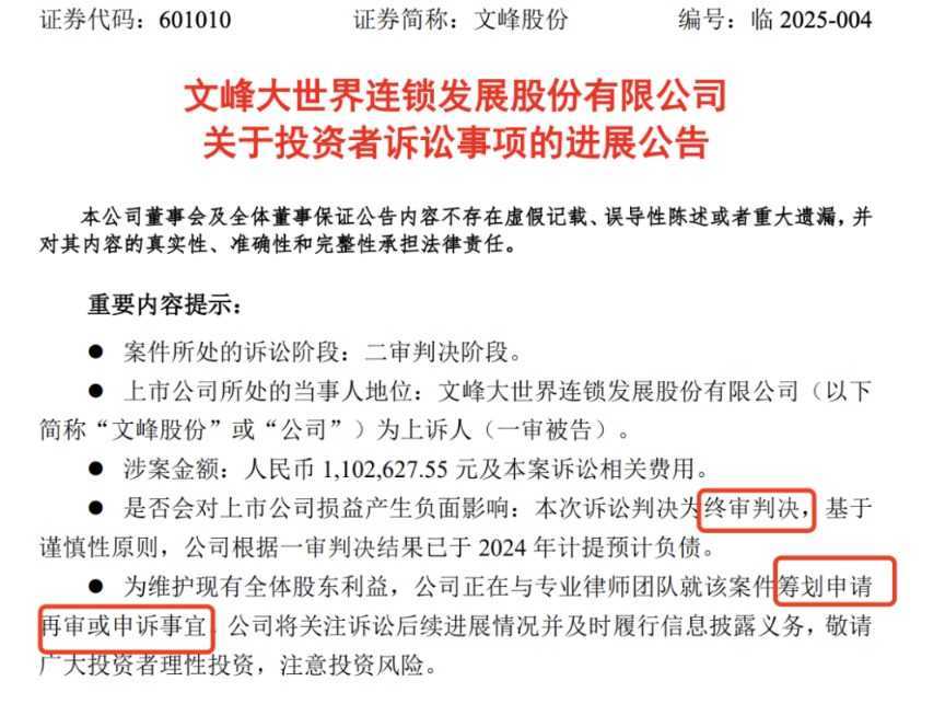 文峰股份不服终审判决,筹划再审或申诉