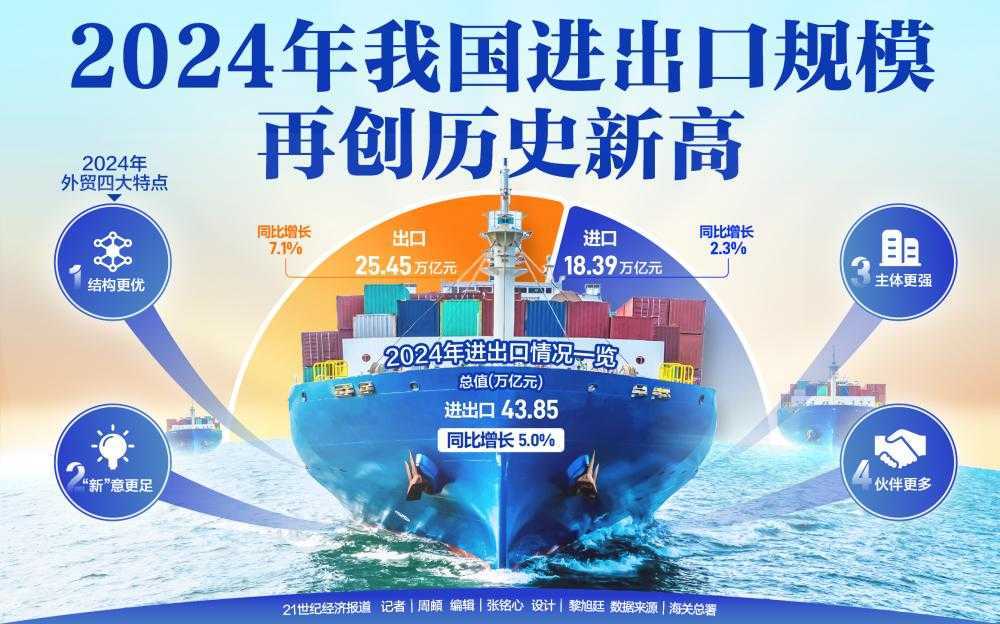 2025年1月13日,海关总署正式揭晓了2024年12月及全年我国货物贸易进出口的详尽数据。数据显示,我国2024年全年进出口总值达到了43.85万亿元人民币,同比显著增长5%。其中,出口总额为25.45万亿元,同比增长7.1%;进口总额为18.39万亿元,同比增长2.3%;贸易顺差更是高达7.06万亿元。