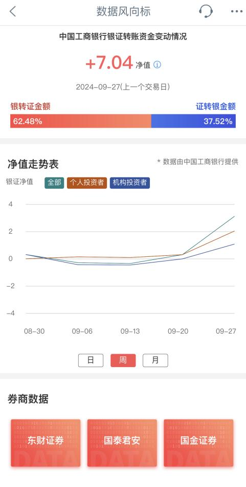 一系列数据的变化为资金加速入市提供了佐证:工商银行的银证转账资金变动情况净值(简称“银证转账指数”)显著攀升,9月27日(上一个交易日)该指数大幅上涨至7.04,与前几日相比有大幅提升,周度银证转账指数也较前几周明显上涨。同时,大额存单市场掀起了一股“转让潮”,部分投资者选择将大额存单转让以获取资金入市,这一现象在微博上引发了广泛关注与热议。这些迹象均表明,近期入市资金的热情远超市场预期。