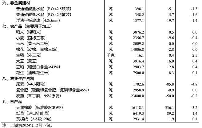国家统计局公布数据显示,2025年1月上旬与2024年12月下旬相比,全国流通领域9大类50种重要生产资料中,16种价格上涨,30种下降,4种持平。其中生猪(外三元)价格上涨2.5%。