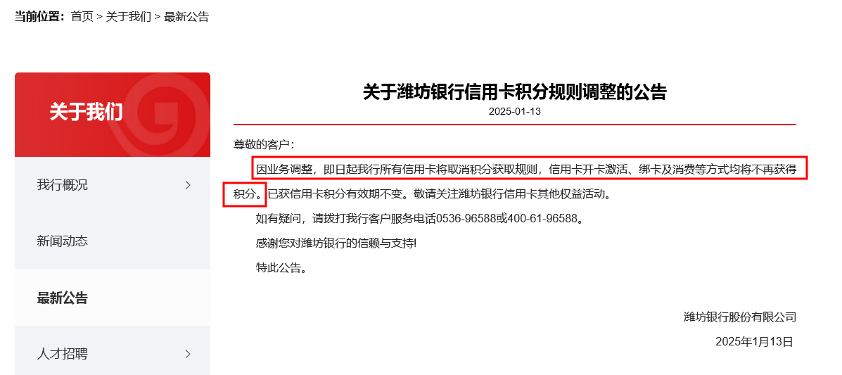 财联社1月14日讯(记者史思同)近日,银行信用卡福利正遭遇前所未有的“缩水”现象,多家银行纷纷对信用卡权益内容、消费优惠以及积分获取规则等方面进行调整。1月13日,潍坊银行发布公告,宣布即日起全面取消信用卡积分获取规则,无论是开卡激活、绑卡还是消费,均不再累积积分。