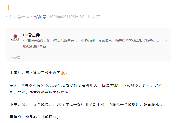 同样在9月26日晚间,中信证券研究在其官方账号上发布了一篇引人注目的文章,标题仅有一个字:“干”。