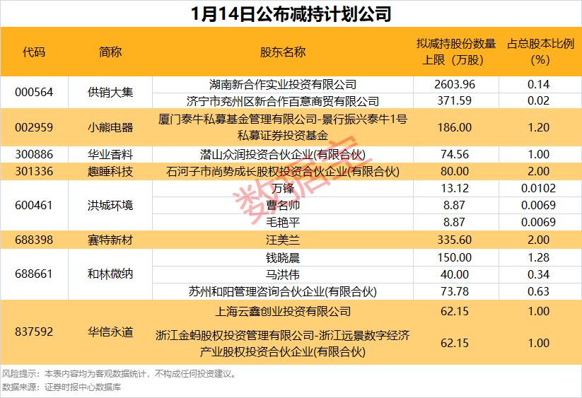 1月14日,市场共有8家公司公布了股东减持计划。其中,和林微纳、趣睡科技和华信永道等公司的拟减持比例较高。具体来看,和林微纳的董事、副总经理和研发中心负责人等股东计划合计减持不超过2.25%的股份;趣睡科技的股东石河子市尚势成长股权投资合伙企业(有限合伙)计划减持不超过2%的股份;供销大集的控股股东一致行动人所持部分股份也可能被司法强制执行,变更后的股份将以市价卖出。