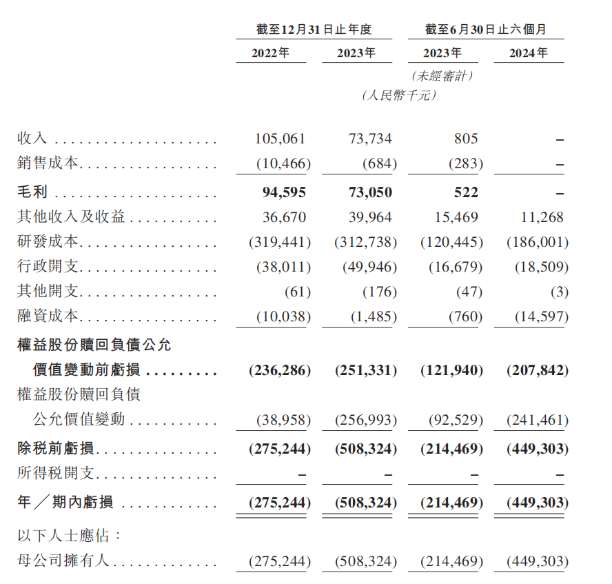然而,《财中社》发现,尽管劲方医药在研发领域取得了显著成果,但其目前仍处于经营亏损状态。2024年上半年,公司未实现任何收入。在2022年、2023年及2024年上半年,劲方医药的收入分别为1.05亿元、7373万元和0元,净亏损则分别高达2.8亿元、5.1亿元和4.5亿元,累计亏损超过12亿元。