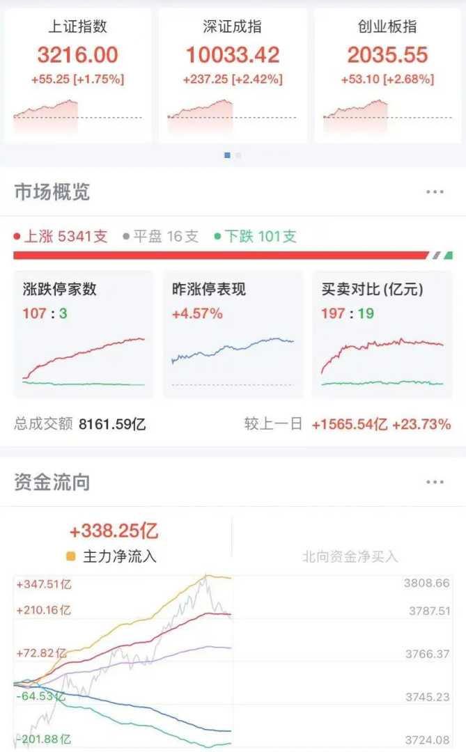 市场数据显示,沪深京三市在午间收盘时,上涨个股数量达到了5341只,其中涨停个股有107只,而下跌个股则仅有101只,跌停个股为3只。此外,沪深京三市的成交额也达到了8161亿元,显示出市场的活跃度。