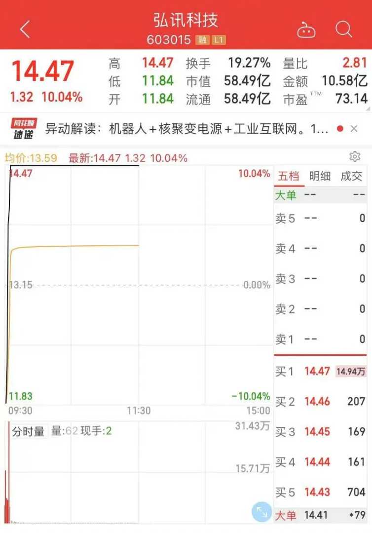 个股方面,弘讯科技早盘上演“地天板”,开盘后不久便触及涨停。截至午间收盘,弘讯科技股价报14.47元/股,走出“6天5板”的强势行情。然而,公司此前已提示风险,称目前主营业务不涉及人形机器人业务,且可控核聚变业务收入占比较小,对公司短期业绩影响有限。