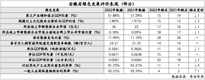 在绿色发展方面,安徽得分为87.1,位列第十二名,位置中上且名次稳定。然而,在清洁能源发电比重这一关键指标上,安徽表现不佳,2022年仅达到11.99%,位列第二十八名。此外,单位GDP用水量也排名后退两名,农业用水的增加是导致这一结果的重要因素。不过,在一般工业固体废物综合利用率上,安徽表现出色,达到93.37%,位列第四名。