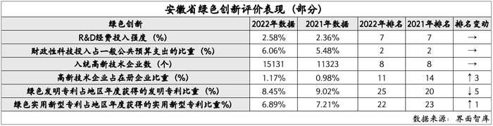 在绿色创新领域,安徽得分为83.81,排名第十一,较上一年度前进一名。安徽省财政性科技投入占比高达6.06%,排名第二;高新技术企业占比也进入前十一名。然而,绿色发明专利占比却有所下降,位列第二十五名。这主要是因为安徽省2022年的培育重心偏向于高价值发明专利。
