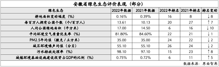 在绿色生态方面,安徽得分84.25,位列第十六名,进步三名。人均公园绿地面积和平均每百万人拥有公园数量均有所提升。然而,城区环境噪声均值和平均环境空气质量优良率等指标排名相对靠后,安徽在空气治理和噪声控制方面仍有待加强。