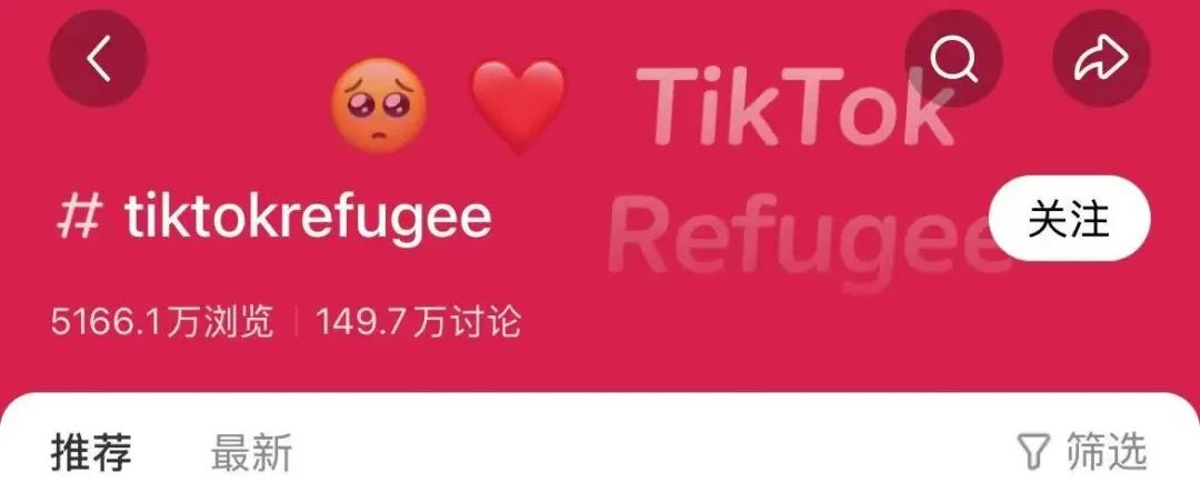 记者查阅小红书平台发现,在名为“TikTokrefugee”的话题下,短时间内笔记数量和浏览量都实现了大幅增长。1月13日下午,该话题下的笔记数量还只有2000多条,总浏览量约39万,但截至发稿时,笔记数量已超过6万,总浏览量更是突破了5100万,讨论量也达到了近150万。