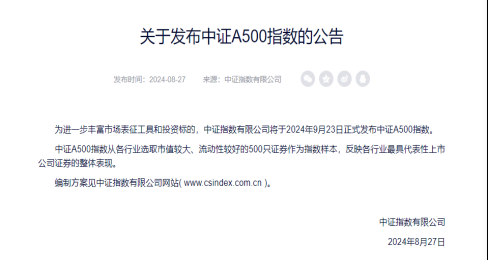 业内人士认为,中证A500指数的推出有望对标标普500指数,为投资者提供全面的市场表征工具和投资标的。摩根资产管理中国总经理王琼慧表示,中证A500指数紧扣新“国九条”推动指数化投资发展的相关要求,丰富了宽基指数的选择,并有望成为中国经济和A股的新风向标。