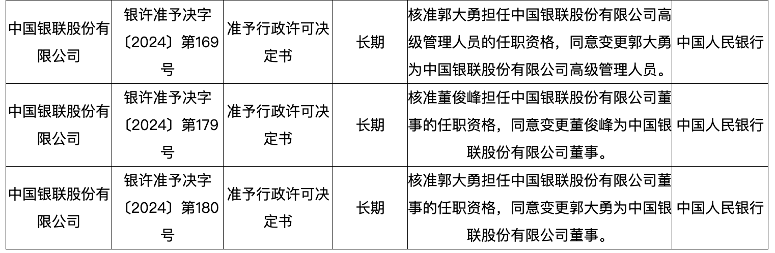 根据中国人民银行于2024年12月31日更新的银行卡清算机构董事和高级管理人员任职资格核准许可信息公示,董俊峰和郭大勇的任职资格已获得核准。董俊峰不仅被同意变更为中国银联股份有限公司董事,还担任了新的董事长职务;郭大勇则同时被同意变更为董事和高级管理人员。