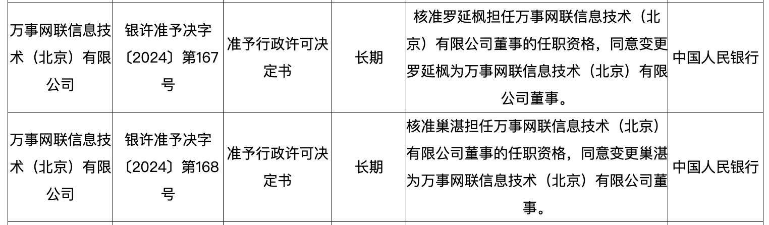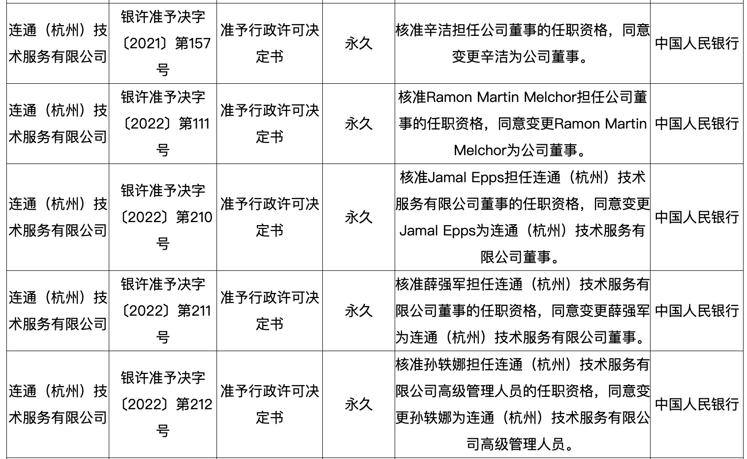 值得注意的是,与中国银联高管任职资格一同获批的还有连通(杭州)技术服务有限公司和万事网联信息技术(北京)有限公司两家银行卡清算机构的高管任职资格。其中,孙轶娜被批准担任连通(杭州)技术服务有限公司的高级管理人员,而罗延枫则被批准担任万事网联信息技术(北京)有限公司的董事。