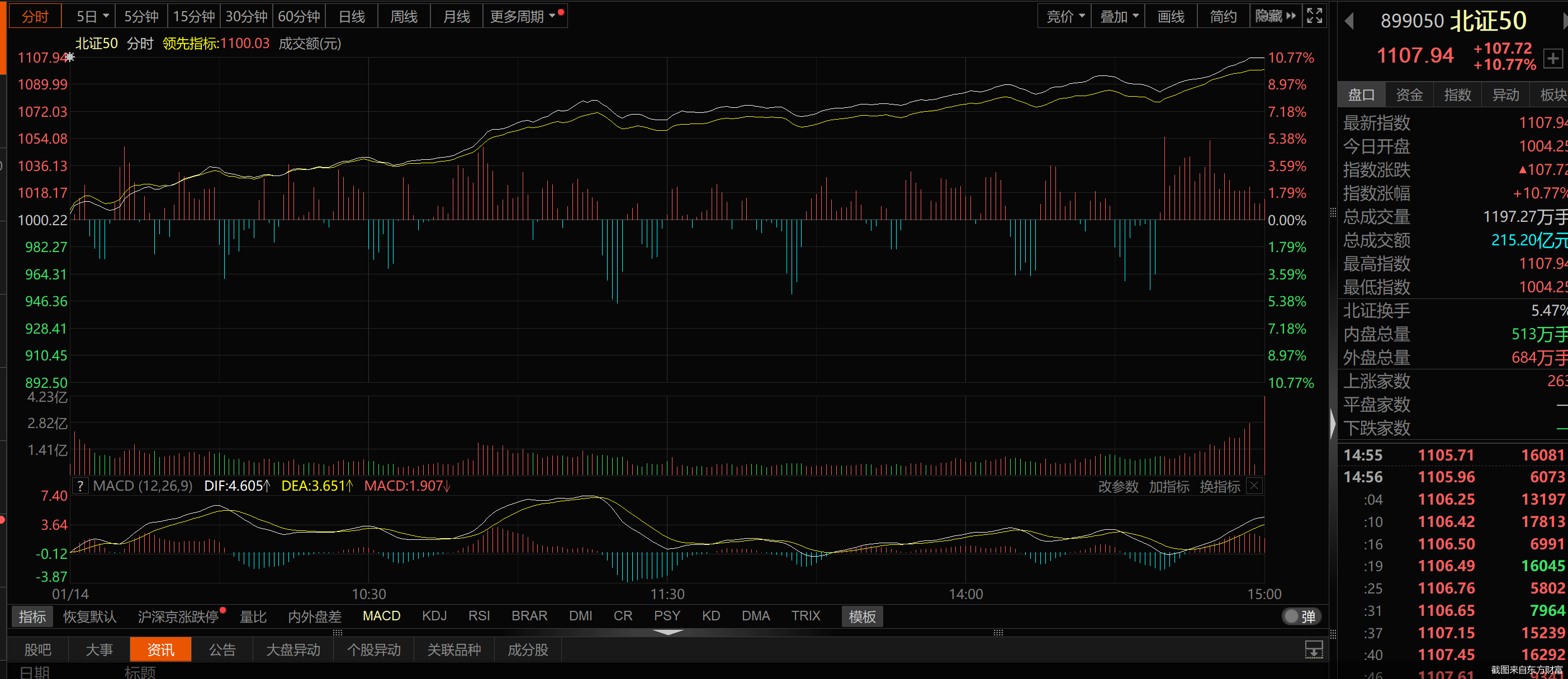 北证50指数的表现尤为抢眼,1月14日,该指数小幅高开0.4%,随后在盘中持续震荡攀升,最终收盘大涨10.77%,报1107.94点,成交额高达215.2亿元。这一涨幅不仅彰显了市场对该指数的强烈看好,也反映出投资者对A股市场整体复苏的信心。