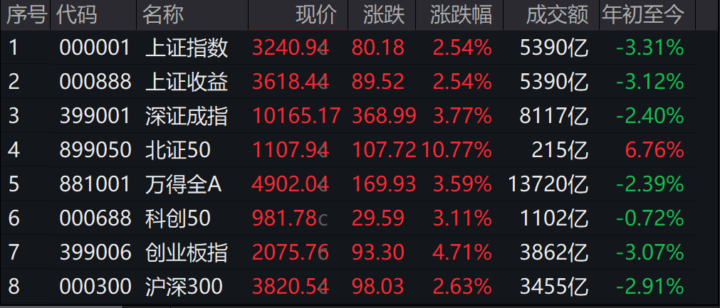 1月14日,A股市场呈现出全面上涨的态势。根据Wind数据的统计,截至当日收盘,上证指数、深证成指和创业板指分别实现了2.54%、3.77%和4.71%的涨幅。与此同时,科创50指数和北证50指数也分别上涨了3.11%和10.77%,上证指数成功站上了3240点。整个A股市场表现强劲,共有5328只股票上涨,市场成交额超过了1.37万亿元,与前一个交易日相比,成交量显著增加。