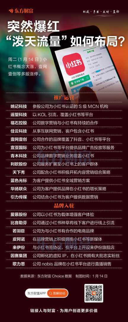 1月14日,小红书概念股集体大涨,福石控股、壹网壹创等个股涨停。小红书国际版RedNote在美国走红,登顶苹果应用商店下载榜。天风证券看好小红书未来发展,认为其独特内容生态和社区理念将打开平台变现空间。