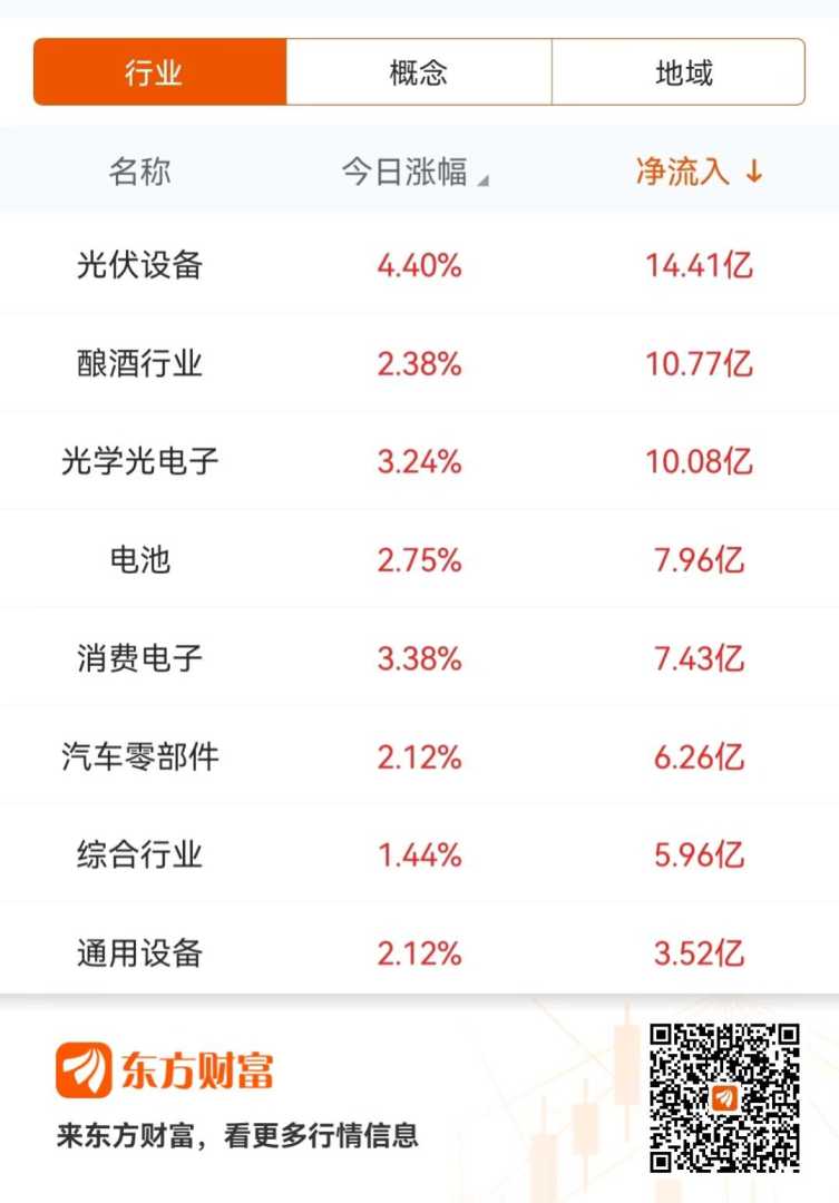 从资金流向来看,光伏设备、酿酒等板块成为今日主力资金抢筹的重点。其中,光伏设备板块净流入资金高达14.41亿元,显示出市场对新能源领域的强烈看好。酿酒板块也获得了资金的青睐。