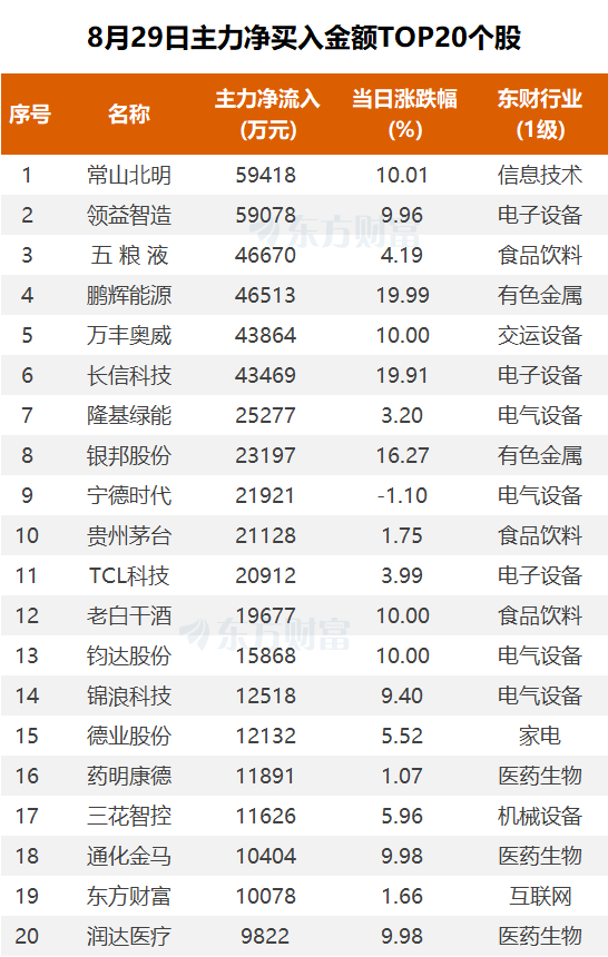 在个股方面,东方财富Choice数据显示,8月29日主力净买入前20大个股中,常山北明以5.94亿元的净买入额位居榜首,该股当日涨停。领益智造紧随其后,主力净买入5.91亿元。这些个股的强势表现,为市场注入了新的活力。