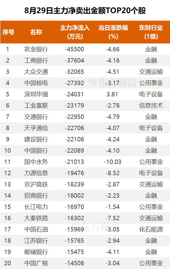 然而,也有部分个股遭到主力的抛售。数据显示,8月29日主力净卖出前20大个股中,农业银行和工商银行分别位居第一和第二,净卖出额分别为4.55亿元和3.76亿元。这些大盘蓝筹股的抛压,对沪指的表现产生了一定的拖累。