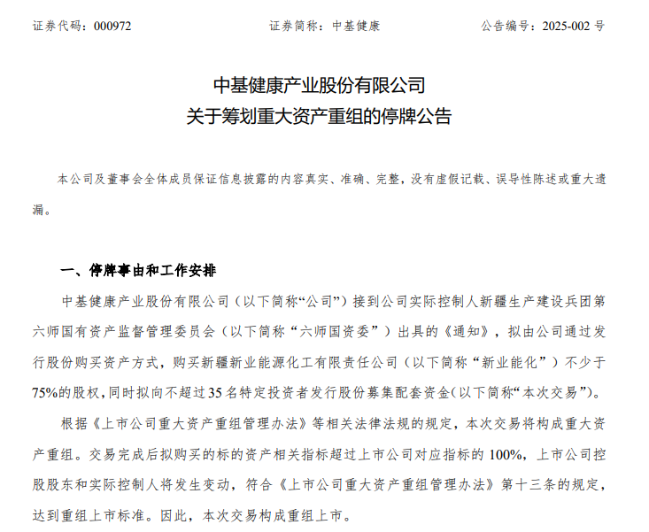 本次重组的具体内容是,中基健康将通过发行股份的方式购买新疆新业能源化工有限责任公司(简称“新业能化”)不少于75%的股权。同时,公司还计划向不超过35名特定投资者发行股份募集配套资金。这一交易完成后,中基健康的控股股东和实际控制人将发生变动,构成重大资产重组,也即重组上市。