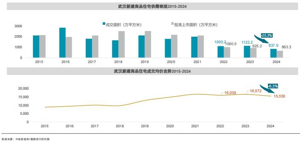 在商品住宅市场方面,2024年武汉成交商品住宅面积837.9万平方米,同比下降约25.3%,市场成交均价也下降了约6.3%。中心城区的房价同比降幅均超过10%,这激发了市场需求的释放,中心城区占全市成交面积的38.3%。截至2024年12月,武汉商品住宅市场整体出清周期已降至17.6个月,较去年6月的30.9个月有了显著改善,市场去库存压力正逐步缓解。