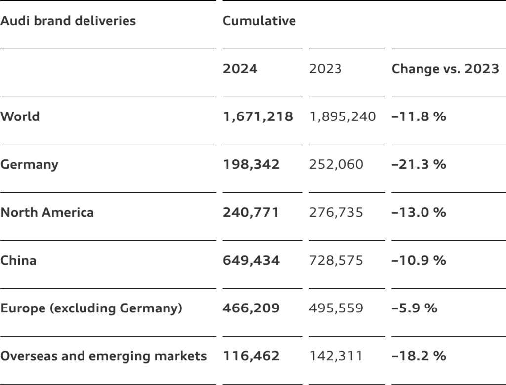 奥迪发布的销量数据则显示,2024年全球销量为167.12万辆,同比下降11.8%。奥迪方面表示,销量下滑的原因主要包括经济形势严峻、市场竞争激烈以及零部件供应受限。在中国市场,奥迪的销量也下降了10.9%至64.9万辆。