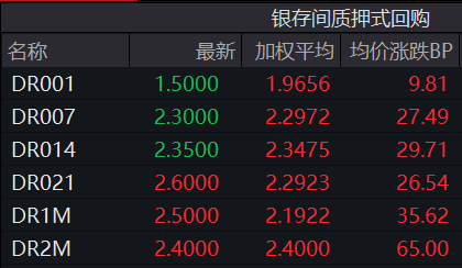 同日,DR001也一度冲上3%的关口,创下了自2023年11月底以来的新高。截至17:00,DR001全天加权平均利率为1.97%,较前一日上行约10BP,最新成交价则回落至1.5%。在同业拆借方面,上海银行间同业拆借利率(Shibor)隔夜报1.965%,上涨14.2BP。