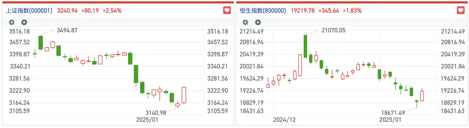 盘后,央行又公布了2024年12月的金融数据,M2、M1增速双双回升,12月新增社融约2.86万亿元,同比多增约9200亿元,这一数据有望进一步刺激市场情绪回温。综合来看,当前港股和A股市场的反弹是多头针对前期连续下跌后的一次蓄力反击,而反弹的持续性和强度将成为本周剩余行情的关键。
