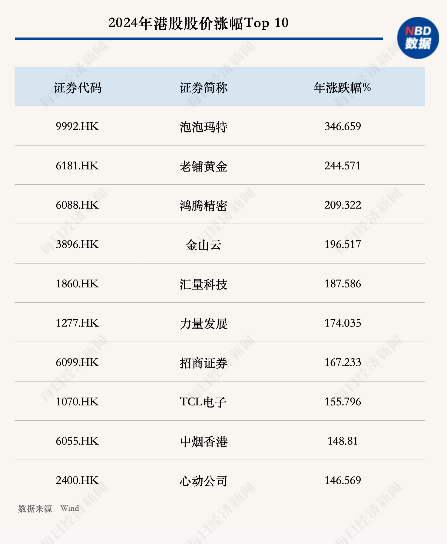 2024年全年,腾讯控股、美团、小米等龙头科技股在市场反弹中表现突出,同时小米和阿里巴巴仍位居南向资金净买入前列。新业态代表泡泡玛特凭借其346.7%的年涨幅领跑港股,老铺黄金、鸿腾精密和金山云等受益于行业趋势,同样涨幅领先。