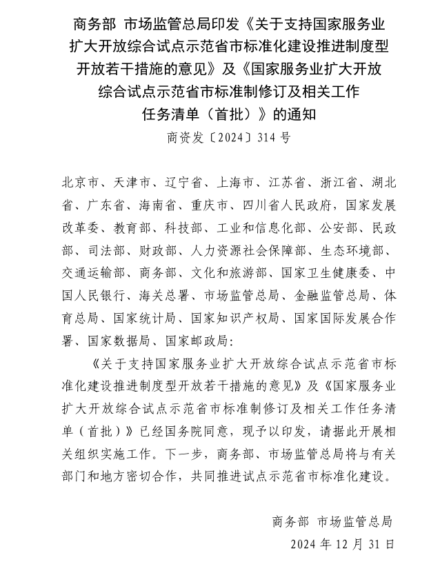 商务部与市场监管总局联合发布意见及任务清单,推动国家服务业扩大开放综合试点示范省市标准化建设,涉及服务国家战略、推进高水平对外开放、完善产业发展根基及构建高效协同体系等方面。