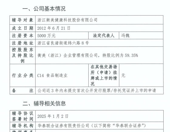 财中社1月14日电 浙江衡美健康科技股份有限公司(以下简称“衡美健康”)于2025年1月2日正式宣布,已与国内知名券商华泰证券(股票代码:601688)的全资子公司华泰联合证券有限责任公司签署了上市辅导协议,并顺利向浙江证监局提交了上市辅导备案报告,标志着衡美健康向资本市场迈出了关键一步。
