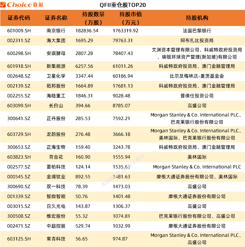 截至8月8日,QFII已出现在27只个股的前十大流通股东中,显示出其对中国资本市场的持续看好。具体来看,法国巴黎银行大举持有南京银行18.28亿股,市值高达176.33亿元;阿布扎比投资局则持有海大集团1695.29万股,市值7.98亿元;安琪酵母被3家机构合计持有2807.28万股,持股市值7.84亿元。此外,高盛公司持有7家A股公司股份,其中5只为二季度新进重仓股。