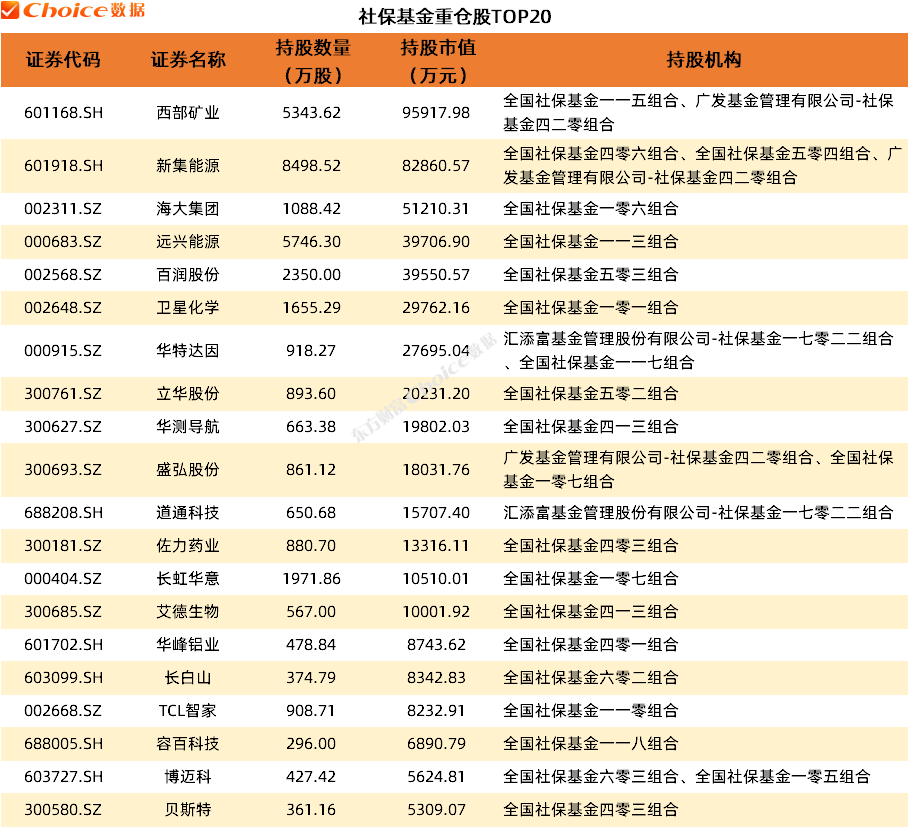 在已公布2024年半年报的上市公司中,社保基金持股动向同样引人注目。西部矿业被2只社保基金合计持有5343.62万股,持股市值9.59亿元;新集能源则被3只社保基金合计持有8498.52万股,市值8.29亿元。此外,长白山、新集能源等多只个股成为社保基金二季度新进重仓股。
